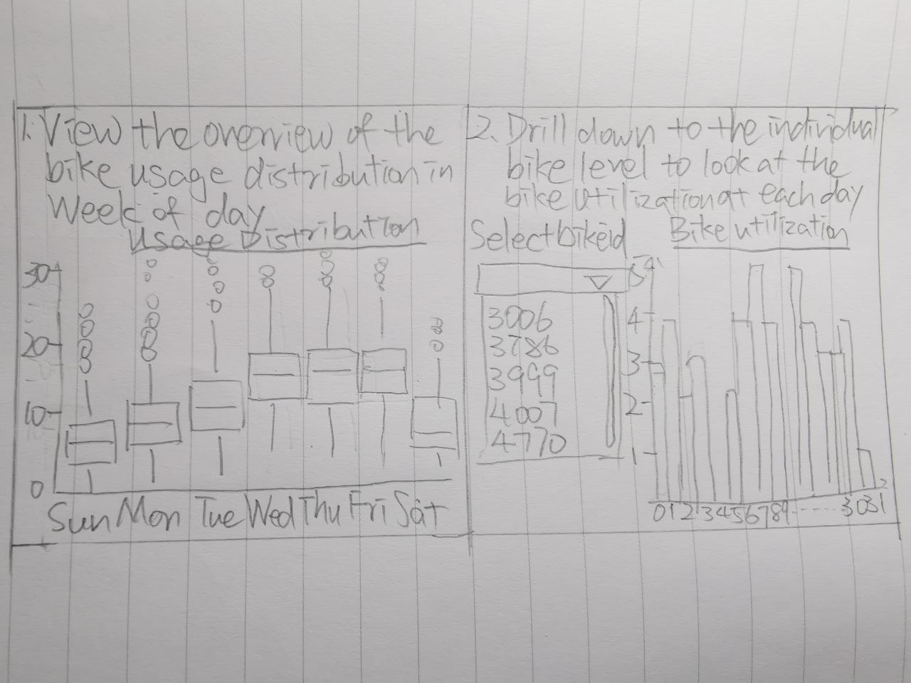 User will first have an overview of the frequency of the bike been used in a month in boxplot for each weekday. And then user could drill down to the individual bike by filtering the bike ID which will be enabled later and have a closer look at the bike uitilization each day in a month.