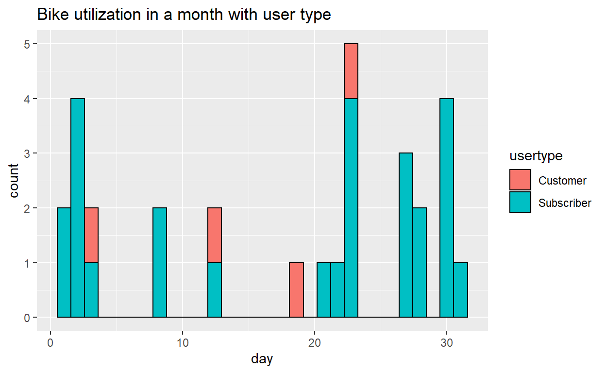 We define the utilization as the frequency of the bike used in a day. This is to display each bike’s utilization by the histogram throughout the month. We have further added the user type as fill to know out of the total number of trips, to get an general idea of the distribution of the bike used by customer or subscriber.